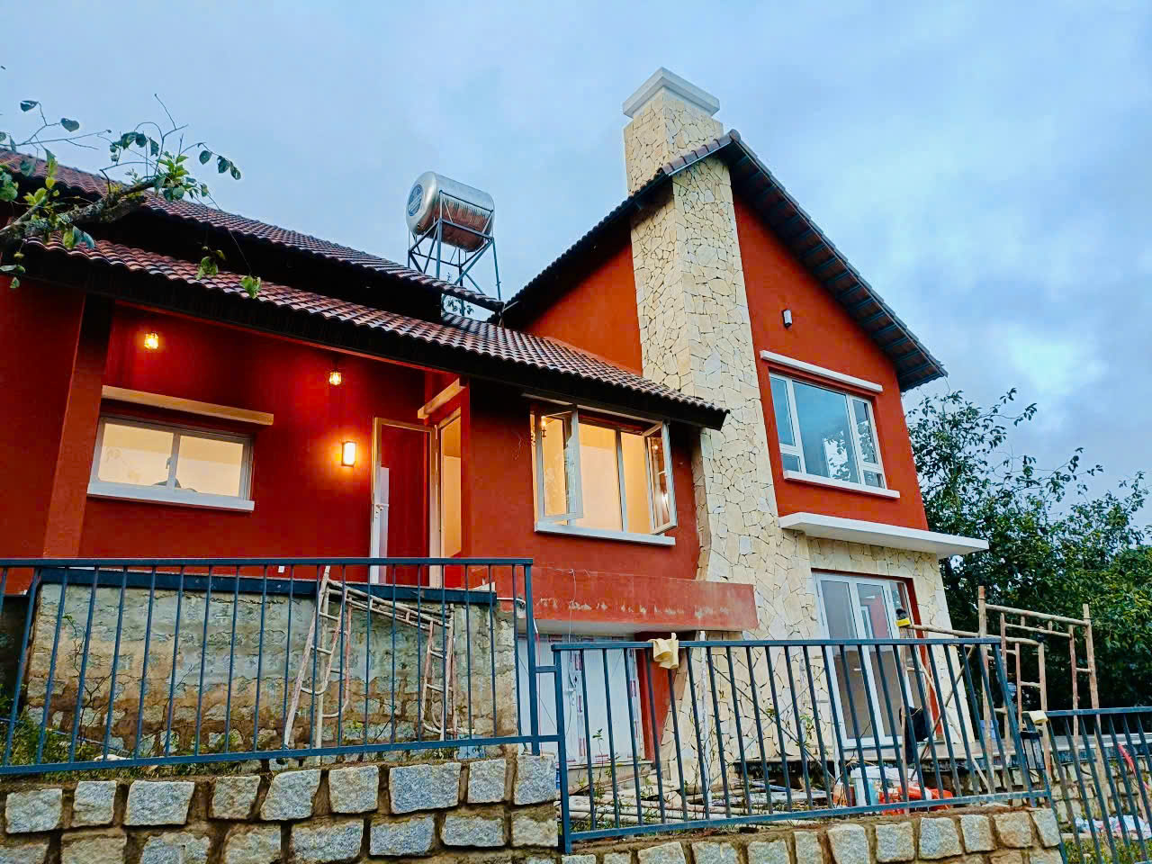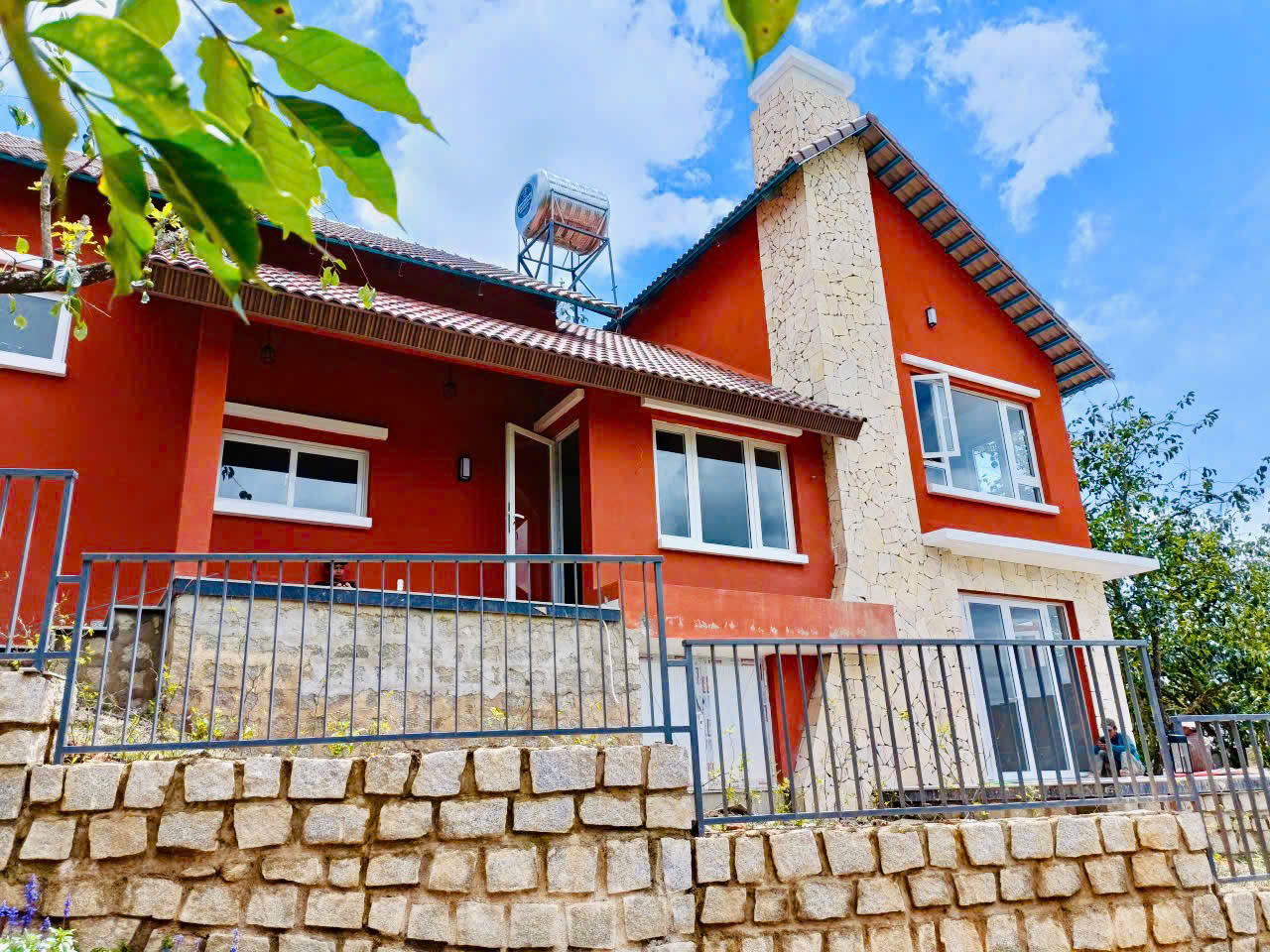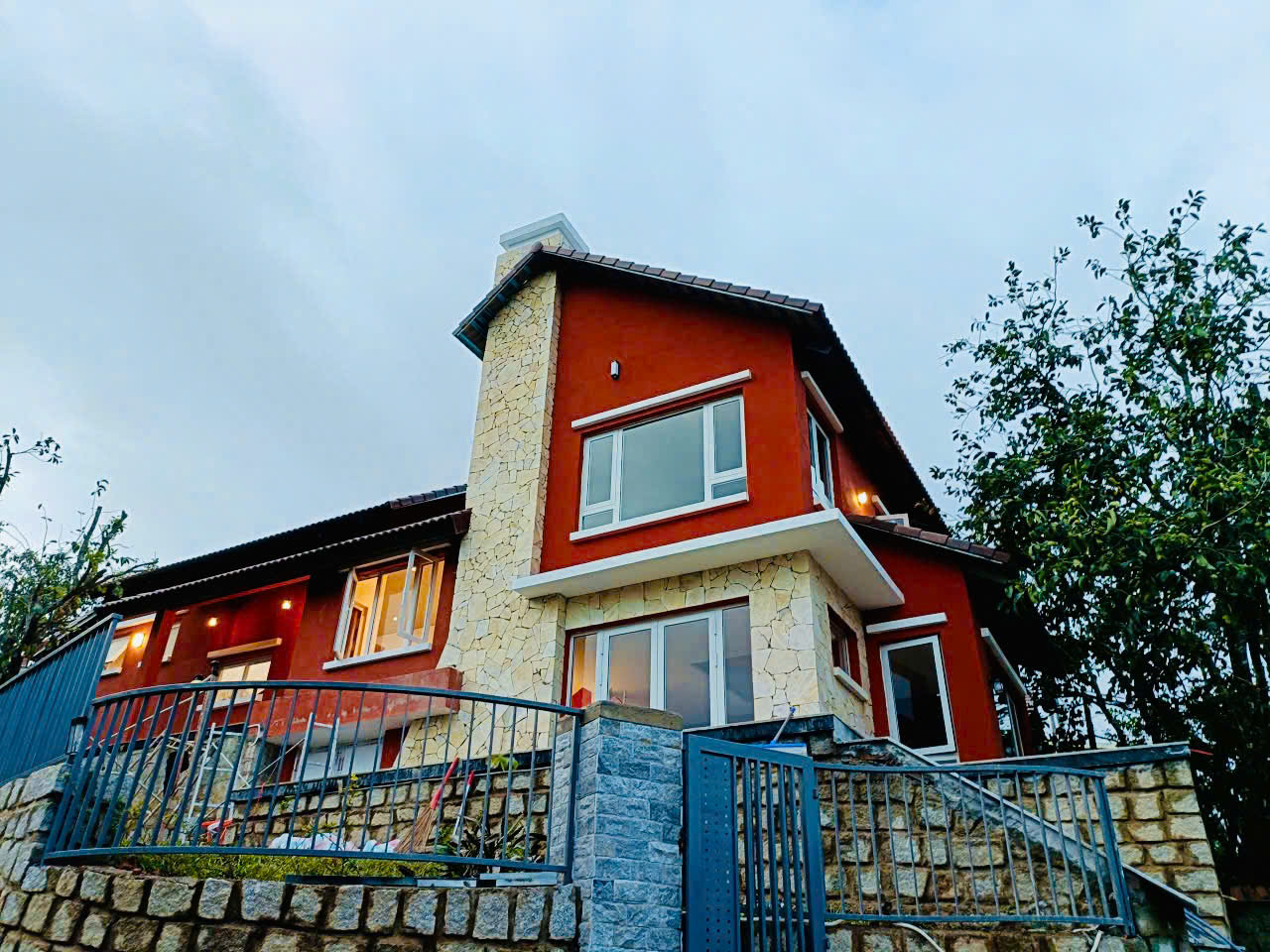 The use of dinaco Eco Clay Paint (Ticao 05) provides the distinctive, warm terracotta red color while ensuring durability and excellent resistance for the façade. The clay finish creates a natural depth of color, pairing perfectly with the surrounding stone and wood elements.